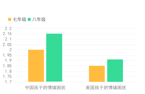 另一方面,升入8年级后,两国孩子的情绪困扰均比7年级时多,但比起美国孩子,中国孩子有着更多的情绪困扰,结果印证了前文提出的推论,见下图5。