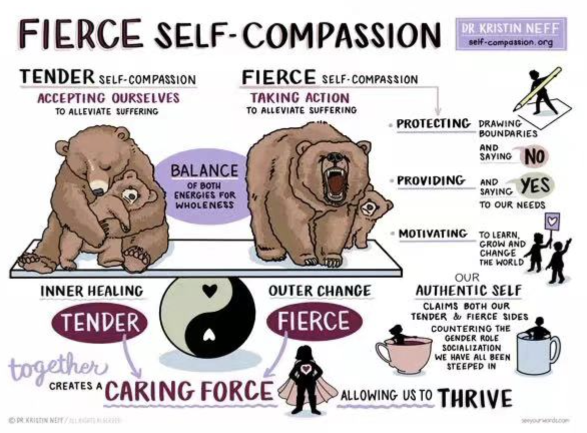 而勇猛的自我关怀是通过「采取行动」的方式来为自己发声,划清边界或是为不公而斗争。