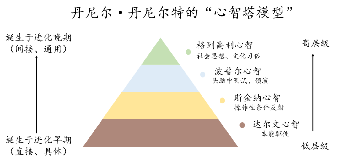 此外,丹尼特还使用“模因”(meme,也译为“文化基因”,“弥母”)的选择进化观点解释了群体视角下人类的意识是如何产生的。在他看来,心智模型中的第一层达尔文心智、第二层斯金纳心智是所有动物共有的,而第三层波普尔心智和第四层格列高利心智才是人类独有的。