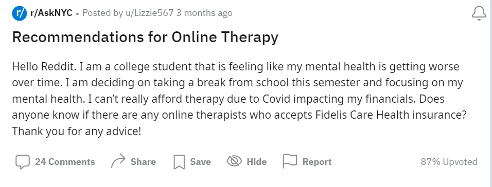 在海外论坛 Reddit 上用关键词“online therapy”搜索,会发现近三个月的时间里有大量的用户发帖求助网友给他们推荐合适的线上心理咨询。