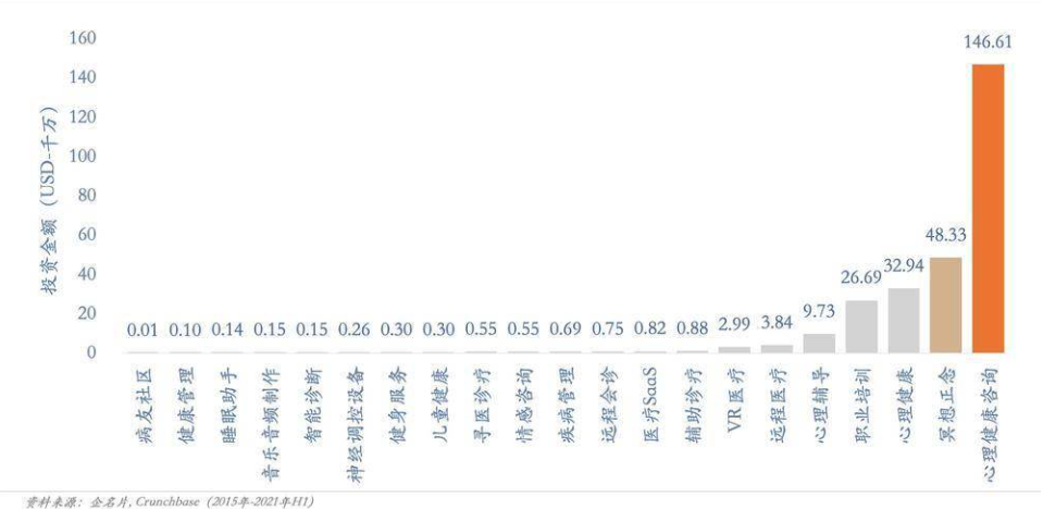 心理健康赛道下面包含了很多子类别,其中心理健康咨询是一个资本重点关注的投资方向,根据数据显示,2015~2021 年上半年仅心理健康咨询赛道上的项目就拿到了资本 53% 的钱,其次才是冥想正念赛道的 17%。除了心理健康咨询和正念冥想以外,职业培训、心理辅导、远程医疗等也都是心理健康赛道上资本会重点关注的方向。