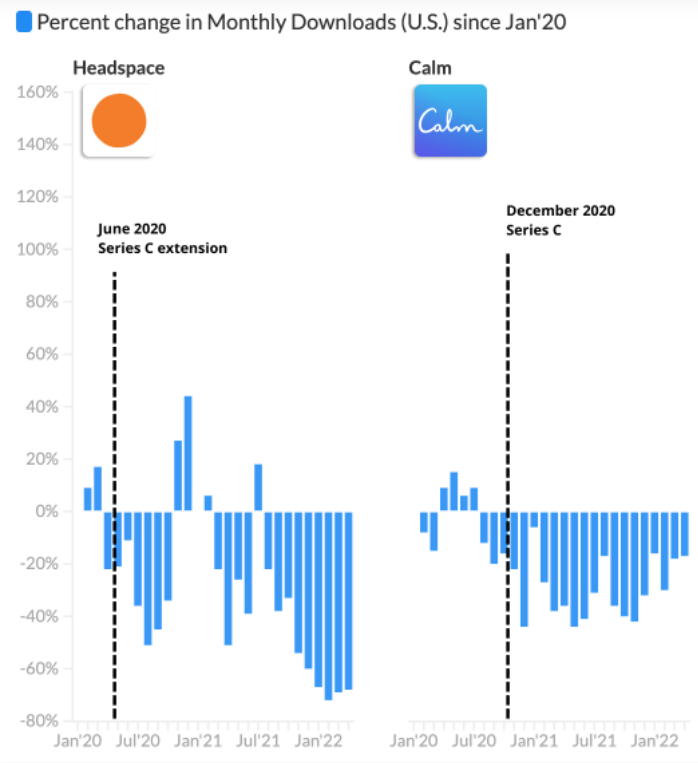 进入 2022 年之后,海外用户的生活状态逐渐恢复正常,冥想作为疫情期间为大家疏解压力的工具 App,也开始被人们“抛弃”。