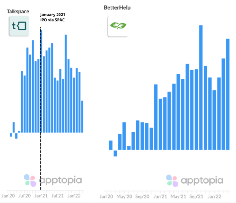但反过来想,冥想应用会话量的下降并不能完全代表心理问题得到缓解、或者心理压力的下降,结合着前一段时间 apptopia blog 发布的另一份数据来看,另一类平台正在承接需求。