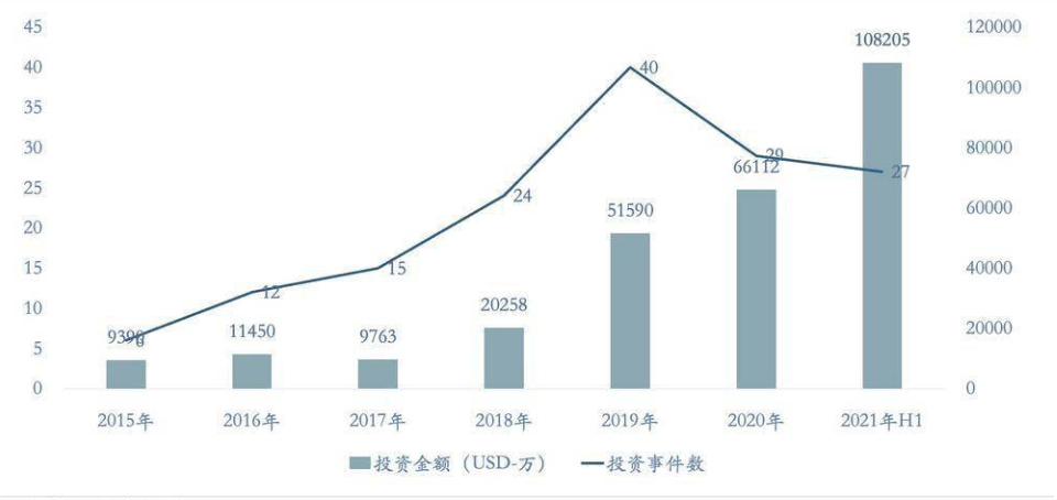 2015~2021 年上半年海外心理健康赛道获得投资的金额以及投资事件数量