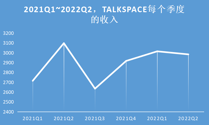 根据 2022 年 Q2 的财报显示,Talkspace 该季度的收入为 2984 万美金。而过去的一年的时间里,Talkspace 单季度的收入基本上也一直维持在 3000 万美金的水平,2021 年 Q2 达到了最高,也只有 3098 万美金。