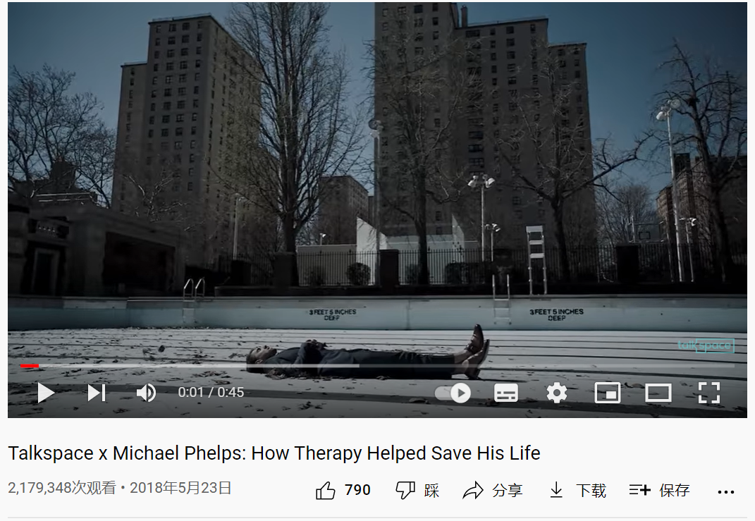 目前菲尔普斯已经与 Talkspace 合作拍摄了多个心理健康方面的短片,其中《Talkspace x Michael Phelps: How Therapy Helped Save His Life》这部短片在 YouTube 上的播放量达到了 217 万次,不仅起到了唤起人们关注心理健康的意识的作用,对 Talkspace 而言也有很重要的品牌宣传的作用。