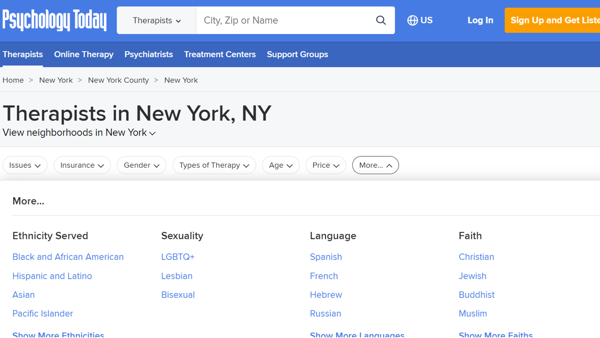 这是相当于是心理咨询师的“黄页”,可以通过筛选性别、种族、语言、特长、流派、保险等各种方式定位咨询师。