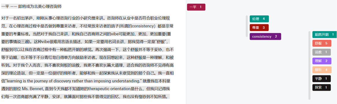 收集了大家的回答之后,我发现这真的是比我想的还要庞大的话题,同行们也提到了我自己没有考虑到的角度,更有写了四千字小作文的,最后我不得不动用了当年做Qualitative Study的软件,将所有咨询师的分享编码分析,尽量保留和引用每位的原话,希望通过这些分享能帮助到感兴趣见咨询师的你。