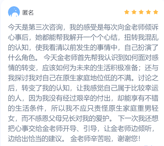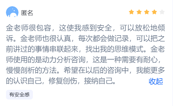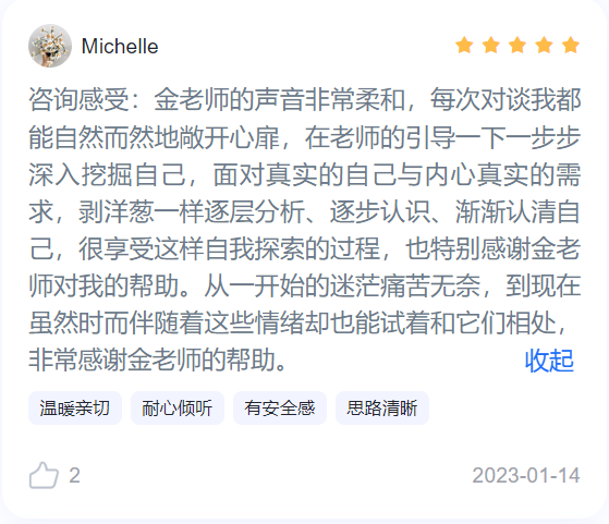 金老师是中科院心理健康指导师、中国心理学会会员,拥有充分的心理咨询理论基础;从业时间超过14年,积累个案时长7200+小时,实践经验丰富。