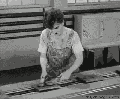 他的工作重复而单调,但他像台机器一样不知疲倦地投入其中。拧螺帽的速度不够,他就追着产品跑,直至被卷入传送带出口;流水线停了,他就拧工友的鼻子、消防栓水龙头,差点把女士的裙扣也拧了……