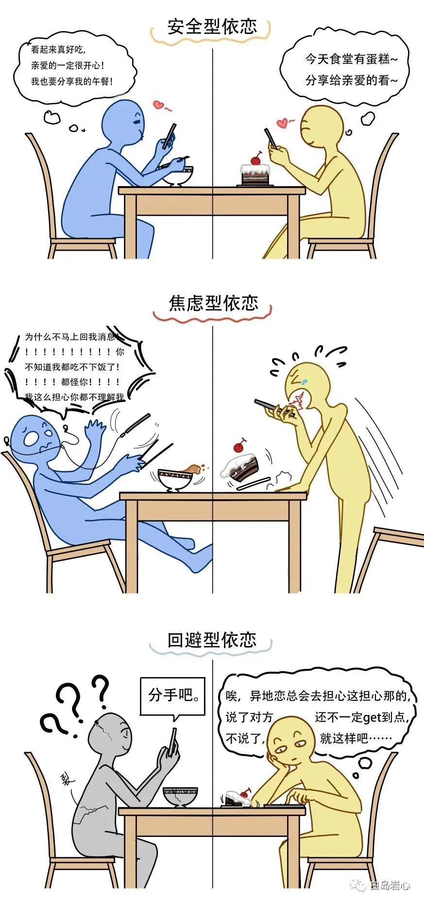 但对于焦虑型依恋的人来说,每天狂轰滥炸般的自我表露却并不会让对方感到亲近,反而会给对方增加情感负担,从而降低对恋爱关系的满意度,导致最后分手。