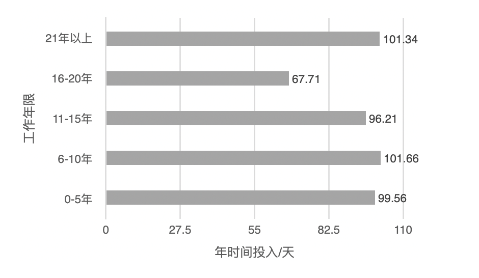 过去一年,咨询师学习投入的天数,平均97.1天,即使工作年限超过10年的,仍稳定在100天左右。