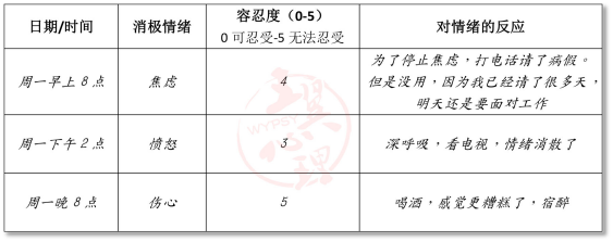 如果仍然无法确定,可以试着在接下来的一周内记录所有体验到的消极情绪并对情绪的不耐受性(即无法忍受、无法管理)进行评估。同时记录你对这些情绪的反应(你是否在努力抑制这些情绪?你克服情绪了吗?你是否实施过有效应对或无效应对情绪的行为?)。你可以按照下面的示例在笔记上进行记录。详细记录和研究自己容忍消极情绪的方式,或许能更好地评估自己是否存在痛苦不耐受的问题。