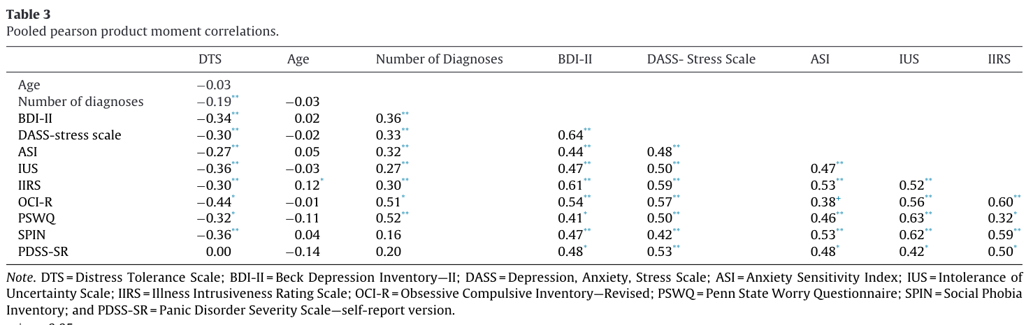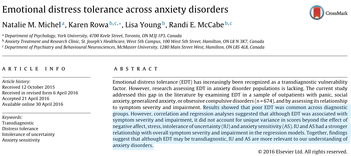 现有的研究表明, distress intolerance负性情绪的不耐受和多种心理疾病相关,例如在物质依赖,进食障碍,边缘性人格障碍,创伤后应激障碍和所有焦虑障碍中,负性情绪的不耐受水平和症状的严重程度显著相关,因此治疗过程中针对性的处理跨诊断的致病因素是实现主要症状和多种共病症状改善的重要步骤。