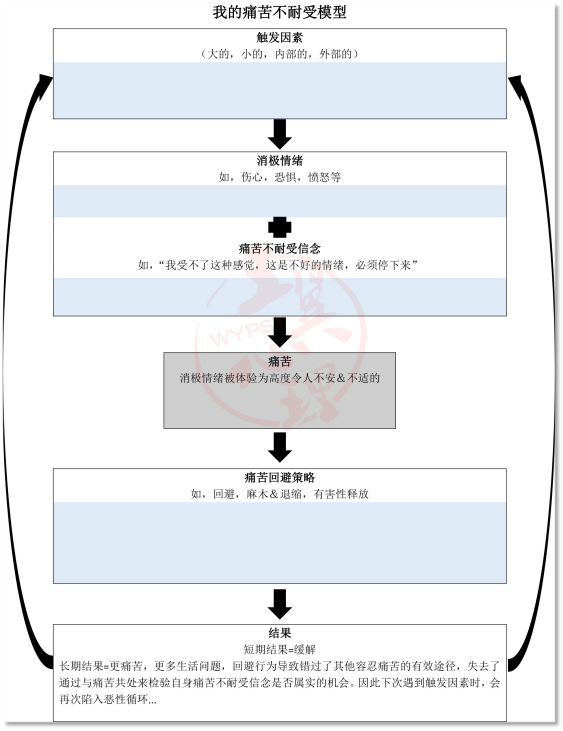 不论触发因素是什么,个体都会开始体验一系列消极情绪。但情绪本身未必令人痛苦,只有当个体抱有痛苦不耐受的信念并告诉自己这种情绪是不好的、需要停止的时候,个体才会感到痛苦。此时个体的情绪体验开始变得极度痛苦和不安,因此试图通过无效的回避策略来停止这种体验。从短期来看情绪痛苦确实会消失,但长期来看只会导致症状加剧。