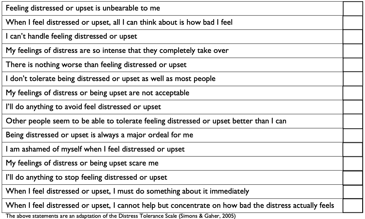 上述语句改编自痛苦容忍度量表 (Distress Tolerance Scale, Simons & Gaher, 2005)