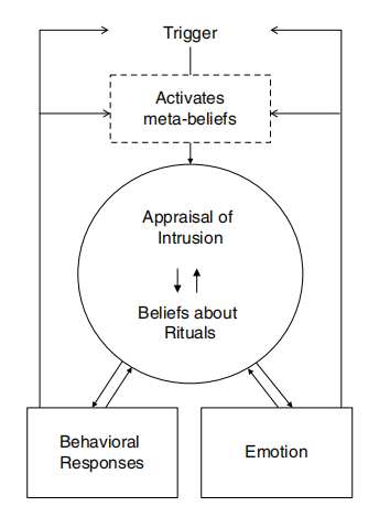 这些行为反应的问题在于维持了对强迫思维的元认知信念,阻止患者去验证这些侵入性想法既不重要也没有危害。在该模型中,焦虑情绪与无效的行为反应均会导致个体对侵入性想法(如怀疑、冲动、意象或其他精神活动)的注意增强。