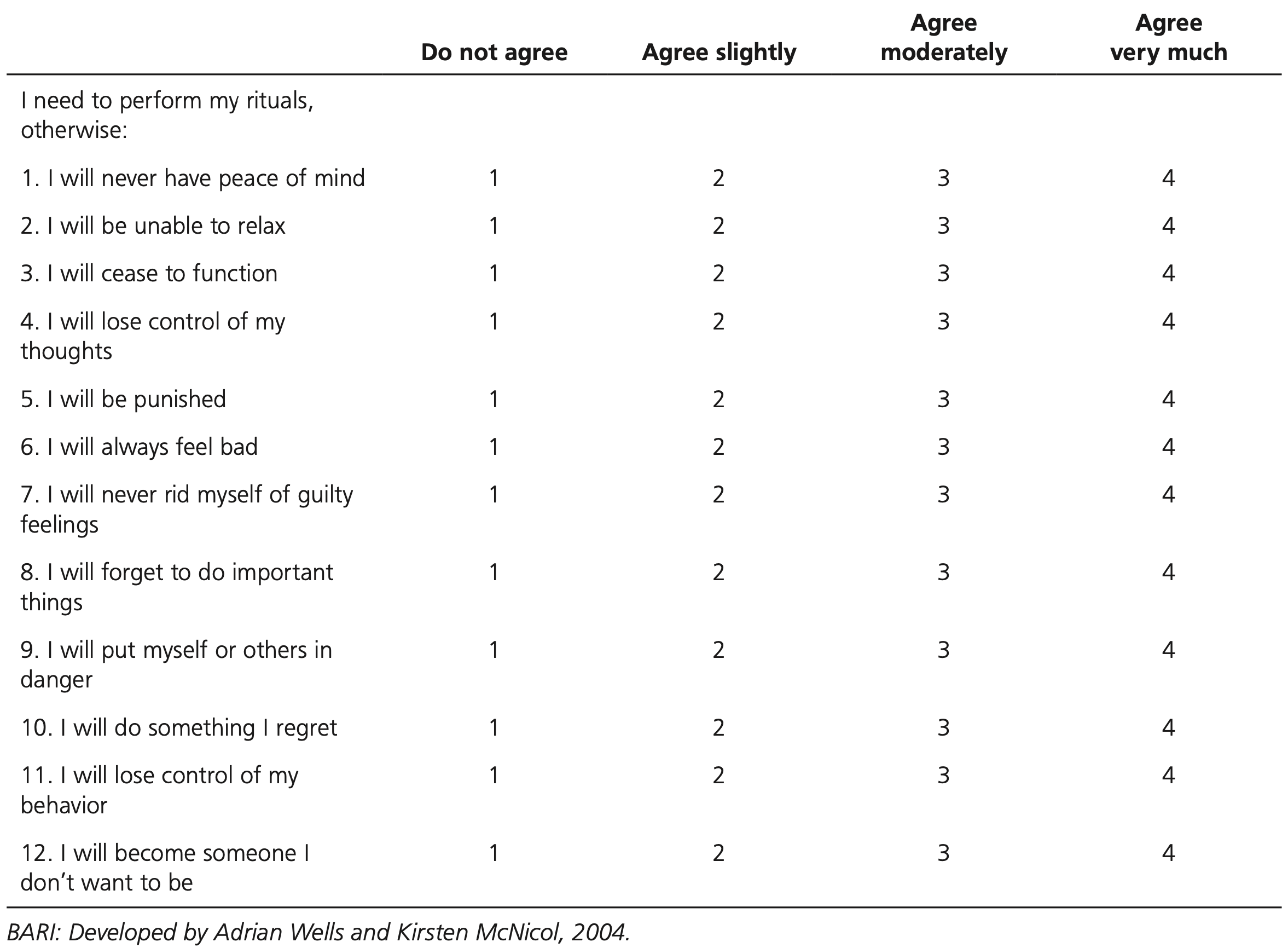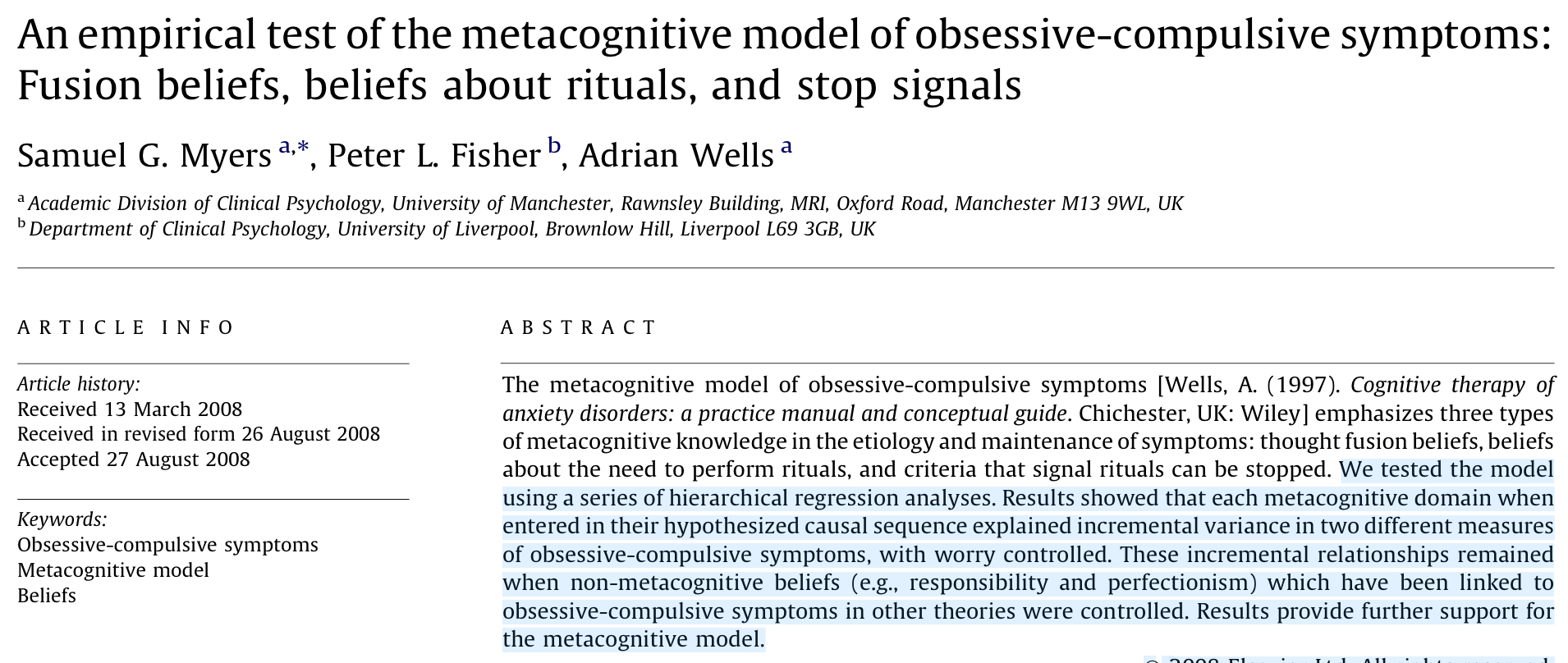 Myers SG, Fisher PL, Wells A. An empirical test of the metacognitive model of obsessive-compulsive symptoms: fusion beliefs, beliefs about rituals, and stop signals. J Anxiety Disord. 2009 May;23(4):436-42. doi: 10.1016/j.janxdis.2008.08.007. Epub 2008 Sep 3. PMID: 18922674.
