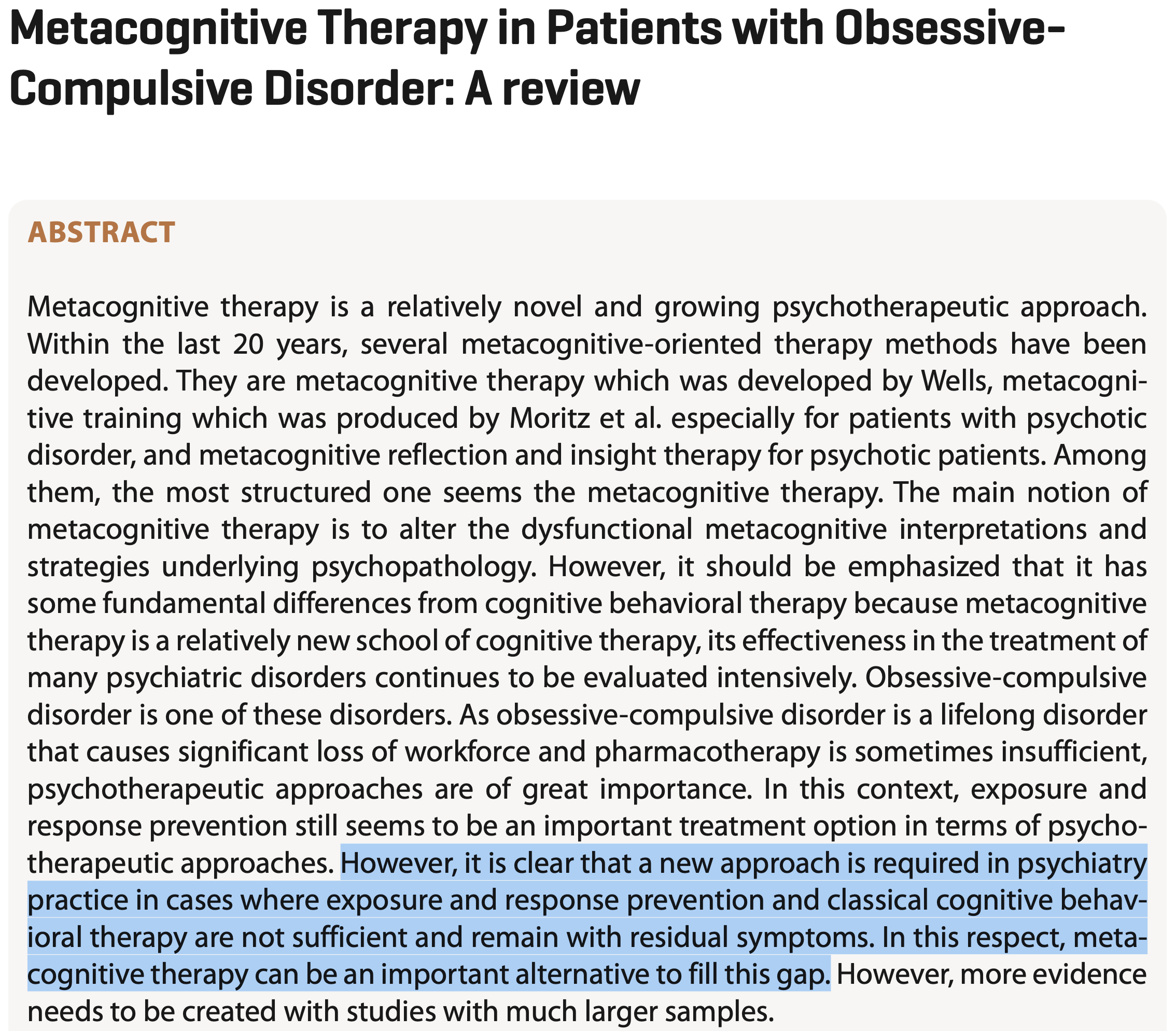 在针对强迫障碍的治疗上,越来越多的研究表明 MCT元认知的治疗方法相较于ERP暴露反应预防都可以有效地改善患者强迫症状,相比于某些患者在暴露过程中的不耐受,MCT是一种可以被推荐的替代性的方法。