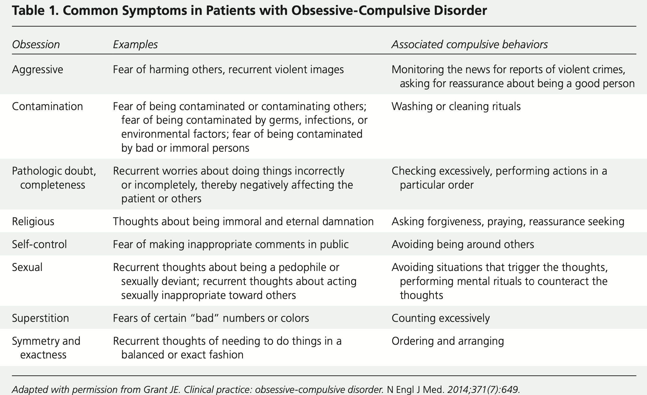 从情绪的角度而言,焦虑(恐惧与担忧)情绪是很多强迫患者最常体验的主要情绪之一,如最常见的几类强迫性思维: