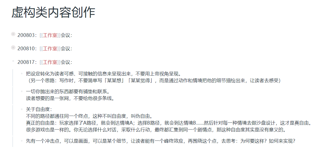 举个例子:前阵子开了几个选题会,会上我自己记录了一些内容创作的点子(也就是前文的「会议记录」)。那么,这些散落在不同会议记录里面的点子,我就可以用一个主题,叫做「虚构类内容创作」,把它们汇总起来。