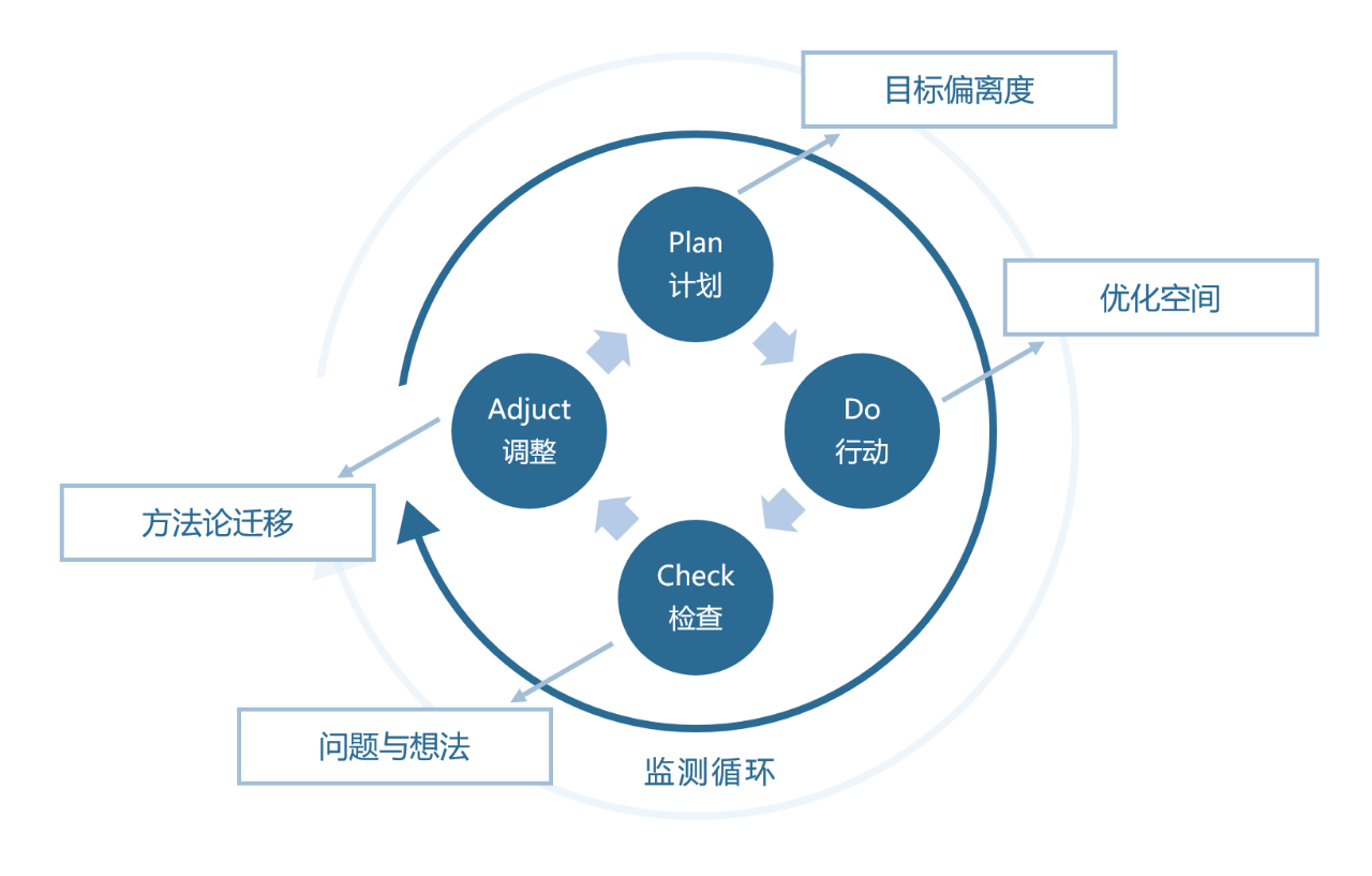但最有效的是什么呢?是给 PDCA 循环,再套上一层「监测循环」,像这样: