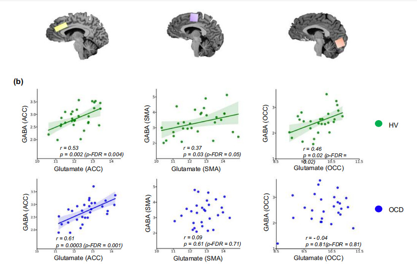 健康与强迫症大脑前扣带皮质、辅助运动区及枕皮质谷氨酸与GABA的关系