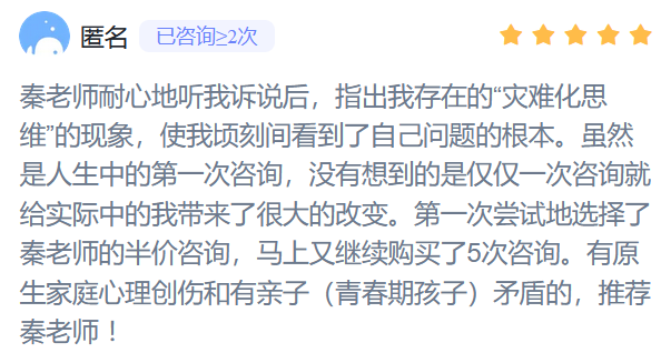 温暖、耐心、温和而坚定是秦老师的咨询风格。特别针对双相情感障碍、自残自伤、自杀倾向、睡眠障碍等较为严重的心理健康问题,秦老师陪伴来访者一起深入探索和修复,重新发现自我、接纳自我,进行有效的疗愈,因此获得来访者的认可与信任。