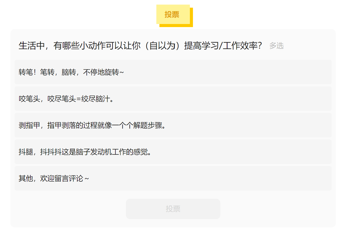 当乖宝宝式的听课坐姿遭遇瞌睡虫的侵扰时,我们完全可以让自己的手动起来——做笔记!当然,抠手手、玩手手等行为不可以呀,这可能会因趣味过多引起注意力从知识点的转移,甚至遭到老师的粉笔头投掷,影响自身与周围同学的安全(正经脸)。