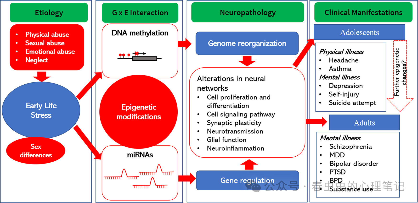 基因与早期生活压力之间的相互作用复杂多样,涉及多种途径。研究基因-基因-环境(G×G×E)相互作用揭示了不同基因因子、童年虐待和抑郁风险之间的复杂关系。理解这些复杂性对于制定有针对性的治疗干预至关重要。