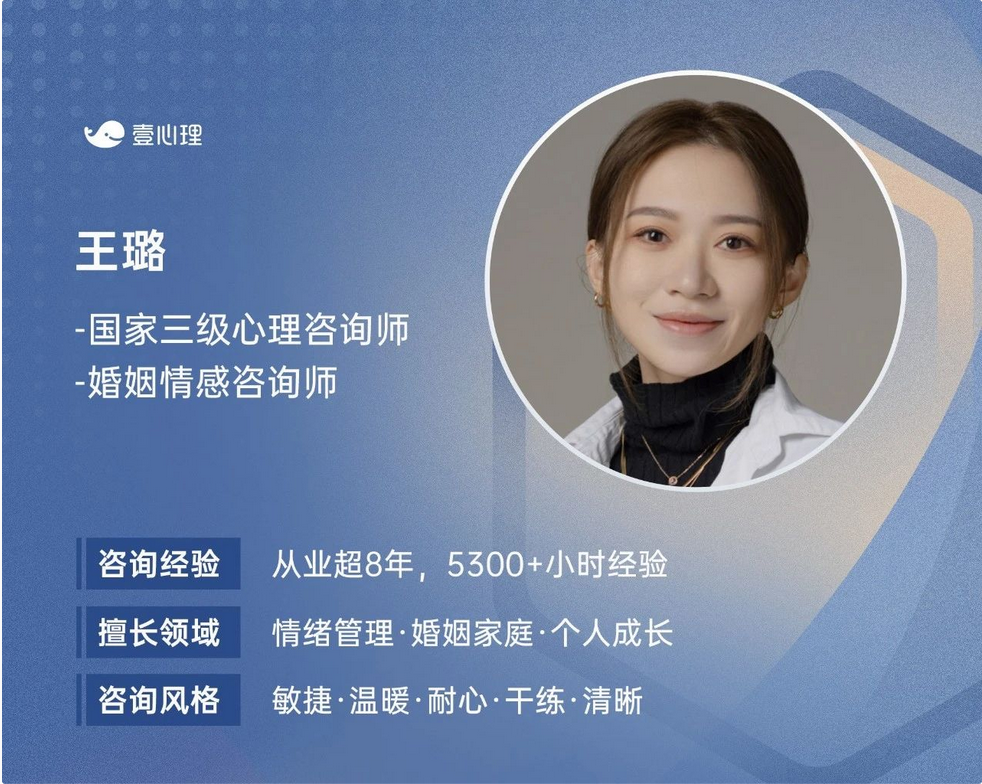王璐老师是国家三级咨询师,从业超8年,服务时长超5300小时,擅长通过心理动力去向、人本主义取向、正念减压治疗等,帮助来访者跨越抑郁焦虑、童年创伤、自我探索等难题。