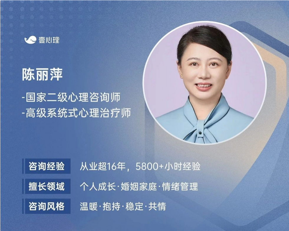 陈丽萍老师是国家二级咨询师,中级心理治疗师,从业超16年,服务时长超5800+小时,擅长通过心理动力取向、催眠治疗、认知行为疗法等帮助来访者跨越个人成长、内心冲突、抑郁焦虑等难题。