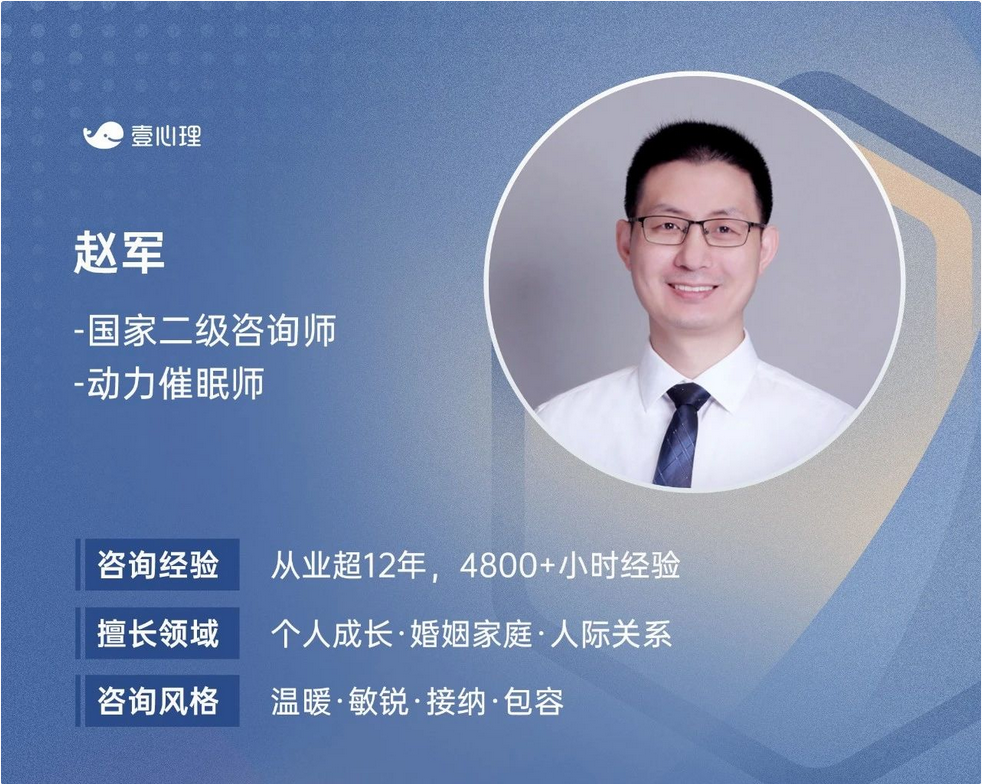 赵军老师是国家二级心理咨询师,从业超12年,积累个案时长4800+小时,擅长以心理动力取向、催眠治疗、家庭治疗、短期焦点治疗等帮助来访者解决亲密关系、抑郁焦虑、家庭创伤等议题。
