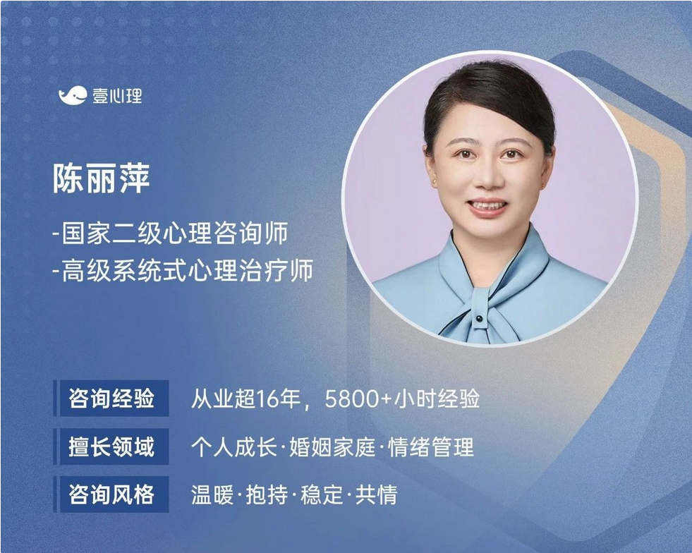 陈丽萍老师是国家二级咨询师,中级心理治疗师,从业超16年,服务时长超5800+小时,擅长通过心理动力取向、催眠治疗、认知行为疗法等帮助来访者跨越抑郁焦虑、亲密关系、内心冲突等难题。