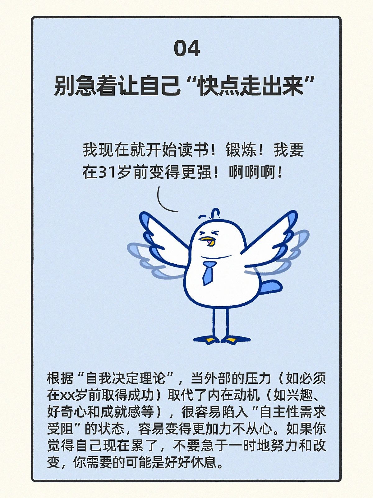 根据“自我决定理论”,当外部的压力(如必须在xx岁前取得成功)取代了内在动机(如兴趣、好奇心和成就感等),很容易陷入“自主性需求受阻”的状态,容易变得更加力不从心。如果你觉得自己现在累了,不要急于一时地努力和改变,你需要的可能是好好休息。