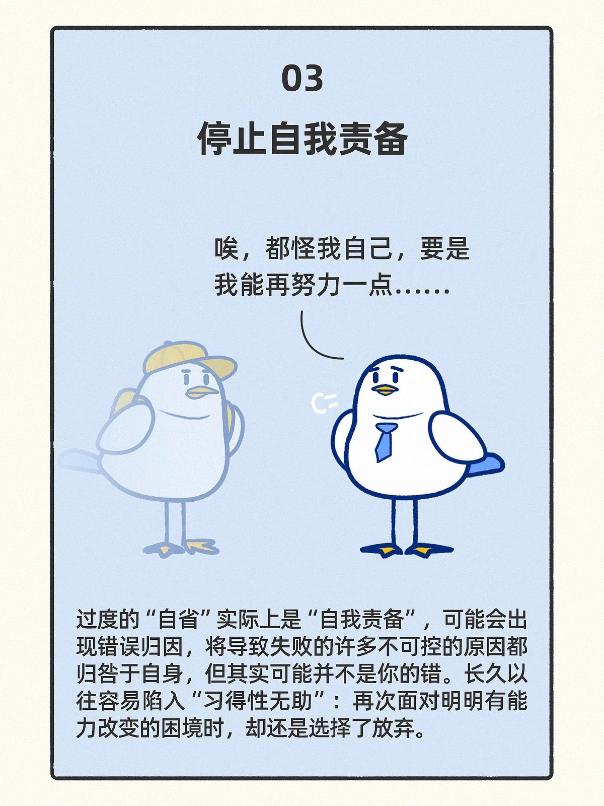 过度的“自省”实际上是“自我责备”,可能会出现错误归因,将导致失败的许多不可控的原因都归咎于自身,但其实可能并不是你的错。长久以往容易陷入“习得性无助”:再次面对明明有能力改变的困境时,却还是选择了放弃。