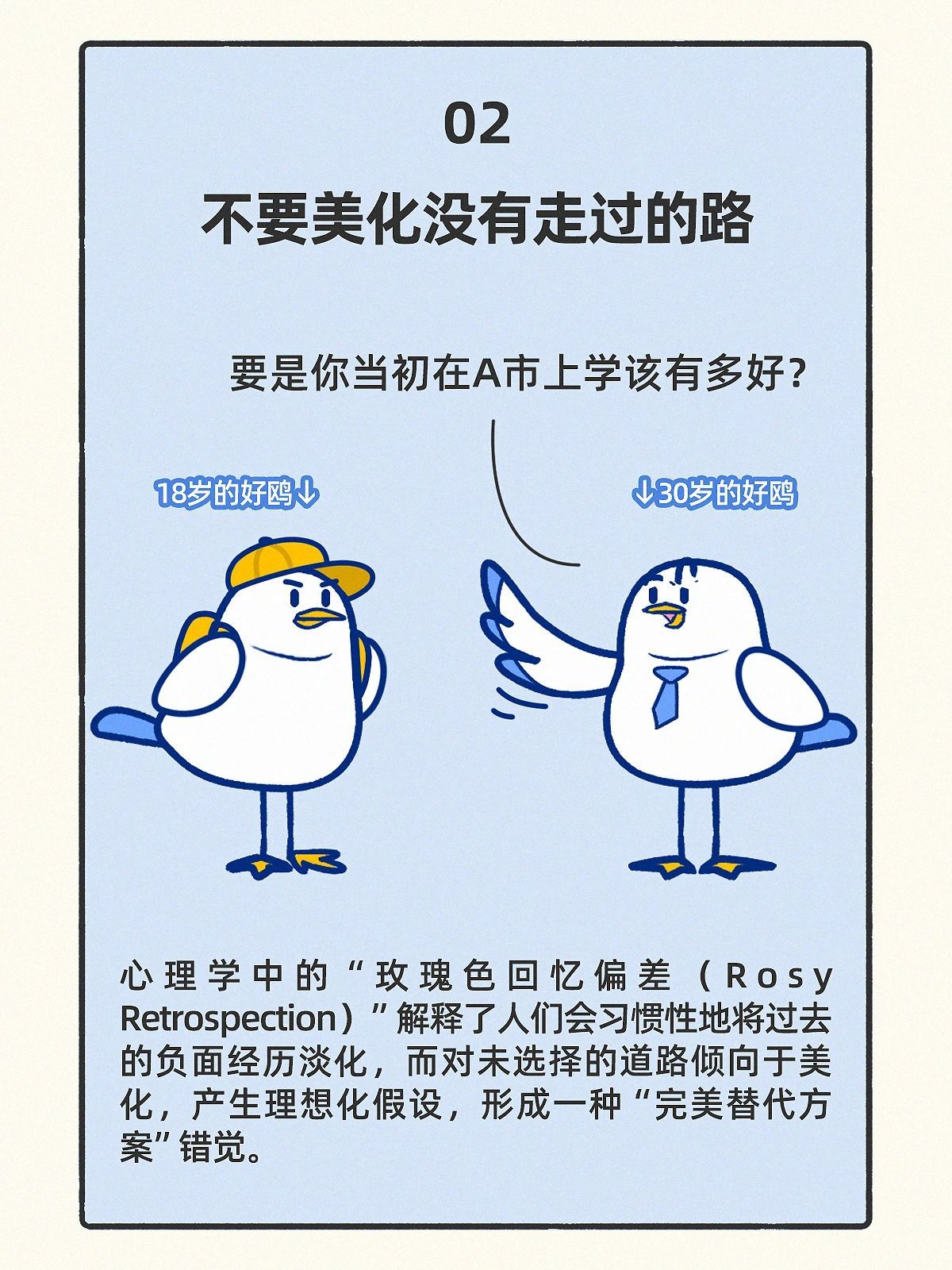 心理学中的“玫瑰色回忆偏差(RosyRetrospection)”解释了人们会习惯性地将过去的负面经历淡化,而对未选择的道路倾向于美化,产生理想化假设,形成一种“完美替代方案”错觉。