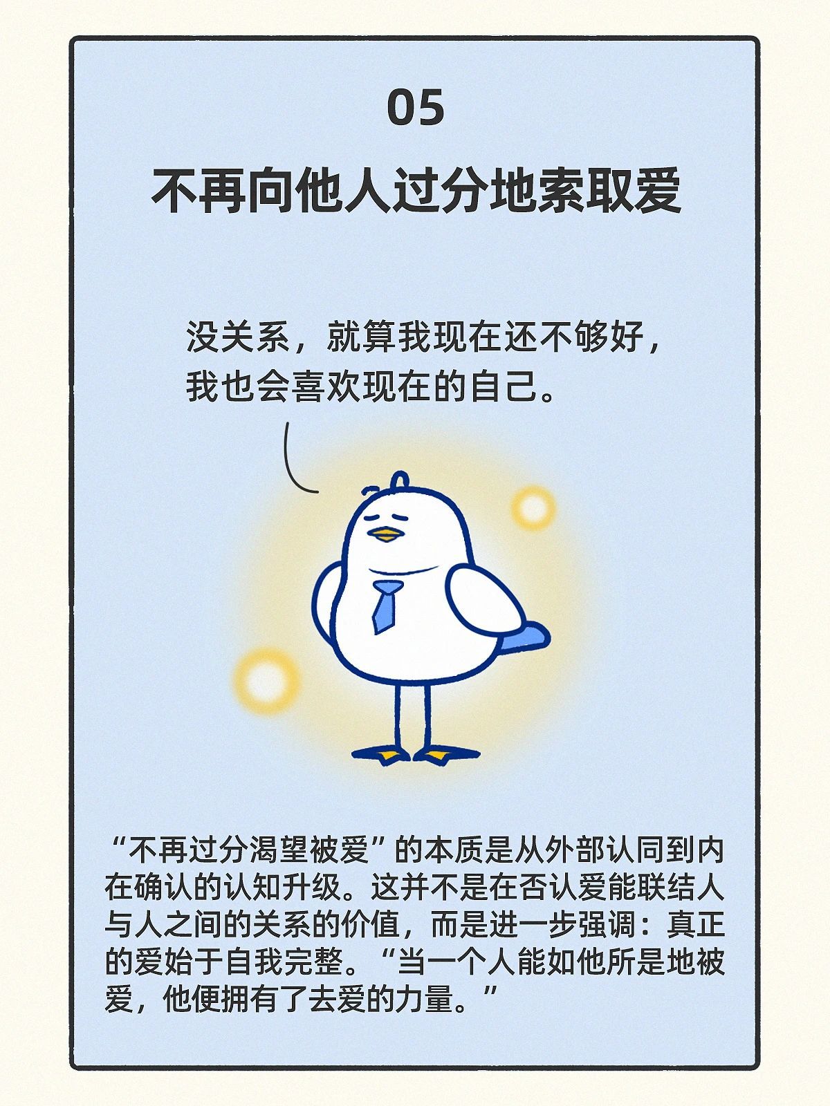 “不再过分渴望被爱”的本质是从外部认同到内在确认的认知升级。这并不是在否认爱能联结人与人之间的关系的价值,而是进一步强调:真正的爱始于自我完整。“当一个人能如他所是地被爱,他便拥有了去爱的力量。”