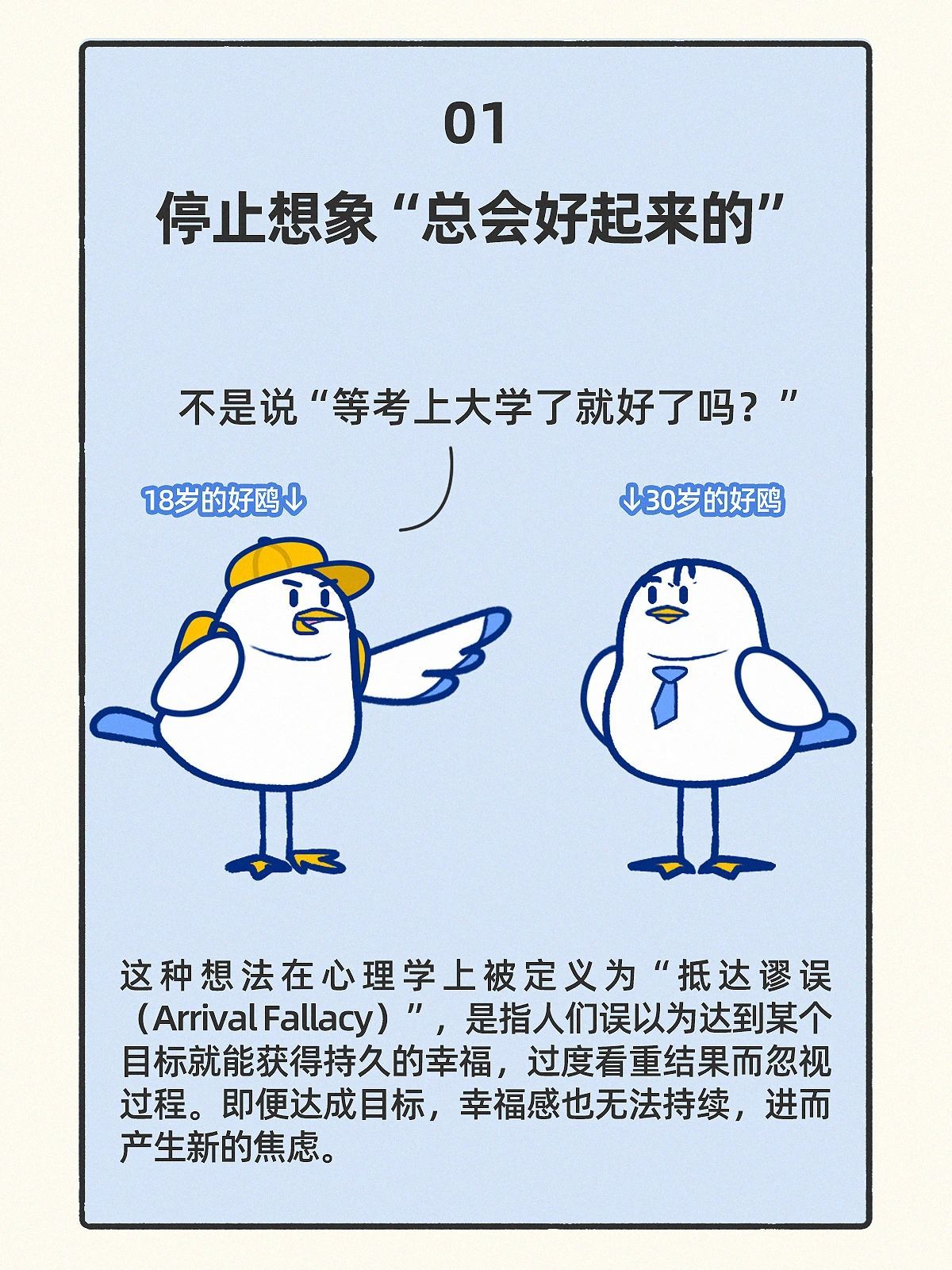这种想法在心理学上被定义为“抵达谬误(Arrival Fallacy)”,是指人们误以为达到某个目标就能获得持久的幸福,过度看重结果而忽视过程。即便达成目标,幸福感也无法持续,进而产生新的焦虑。