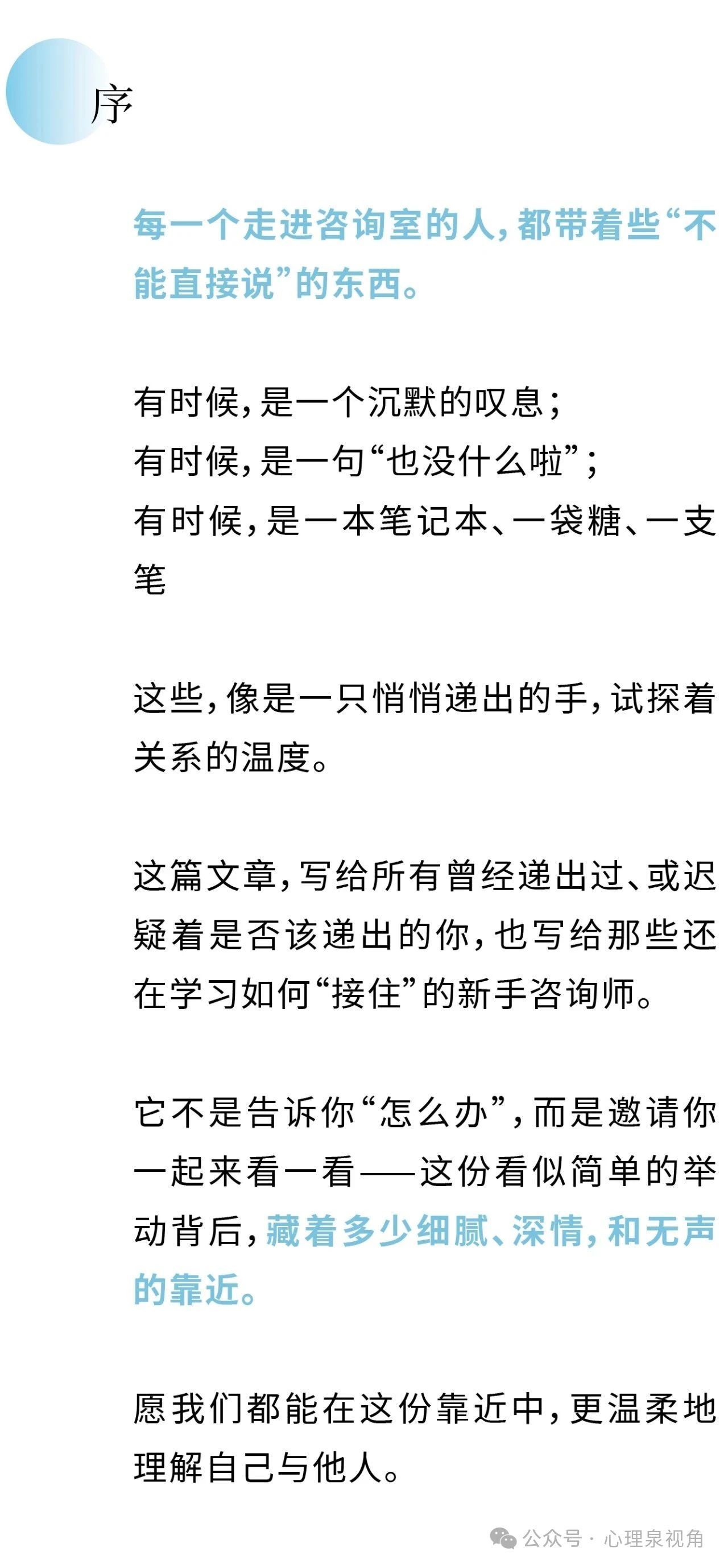 它是来访者迈出的脚步,是他们的试探、信任、焦虑或温柔,而我们要做的,不是匆忙处理,而是留心体会。
