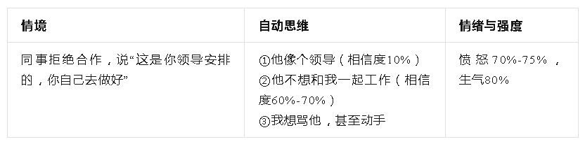 在案例中,小璐最强烈的自动思维是“他不想和我一起工作”,相信程度60%—70%。
