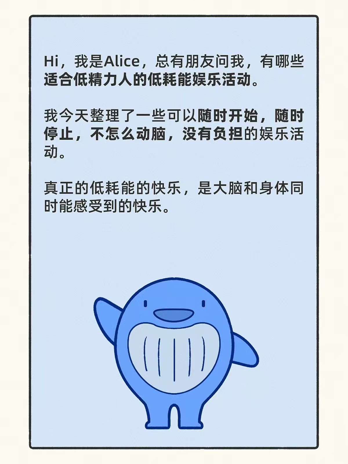 Hi,我是Alice,总有朋友问我,有哪些适合低精力人的低耗能娱乐活动。