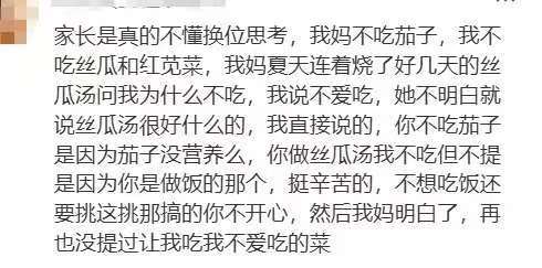 比如告诉父母:“我喜欢喝的不是丝瓜汤,而是排骨汤、罗宋汤。你们愿意试试我喜欢的味道吗?”