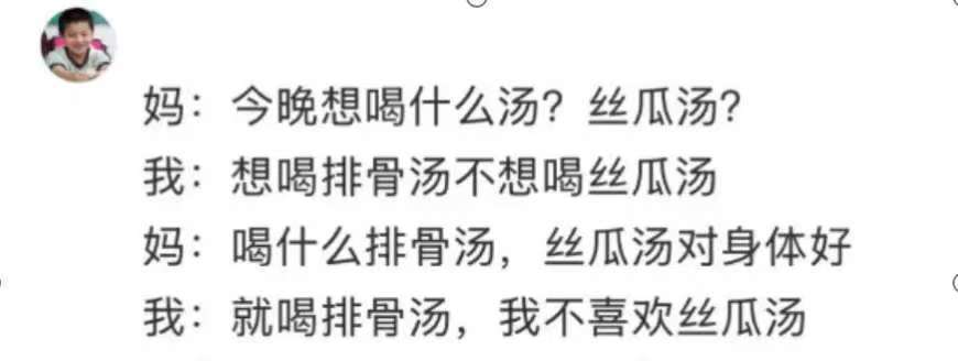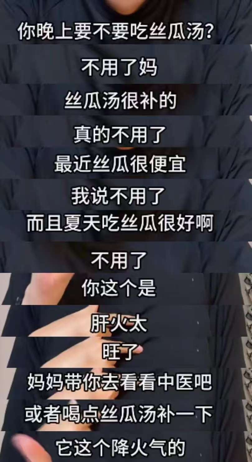 妈妈问儿子喝不喝丝瓜汤,儿子表示不想喝,妈妈便开始花式吹捧“丝瓜汤”的功效。