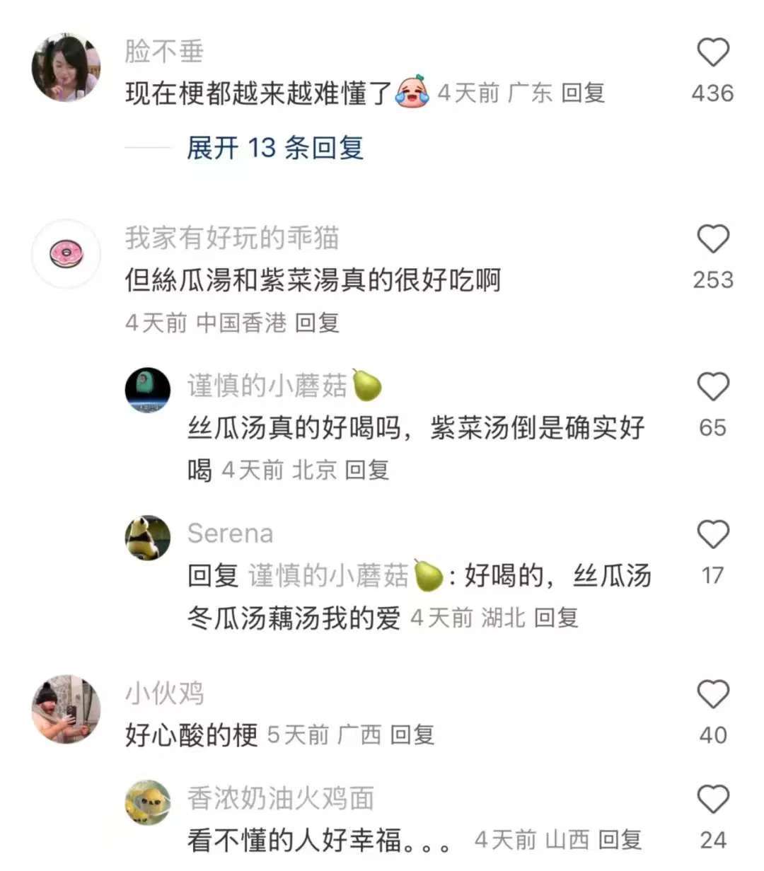 很多网友说几期视频追下来,再也无法直视“丝瓜汤”这三个字,因为“这感觉太熟悉了”。