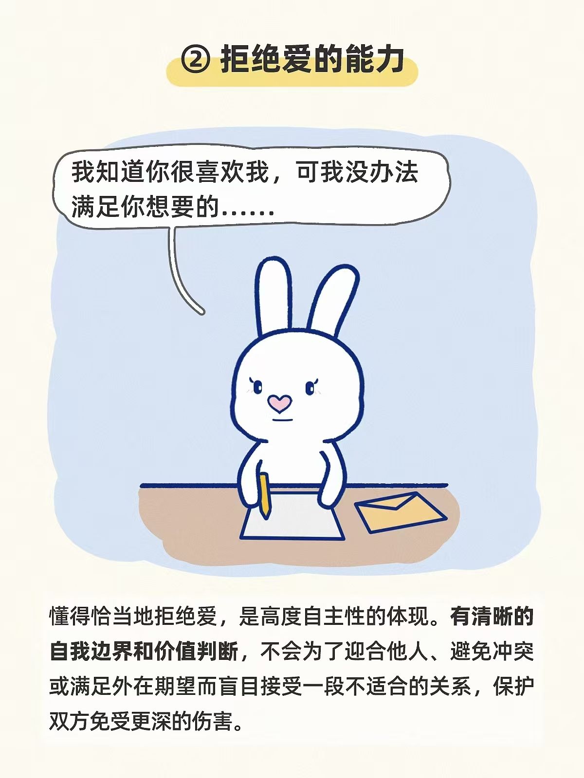 懂得恰当地拒绝爱,是高度自主性的体现。有清晰的自我边界和价值判断,不会为了迎合他人、避免冲突或满足外在期望而盲目接受一段不适合的关系,保护双方免受更深的伤害。