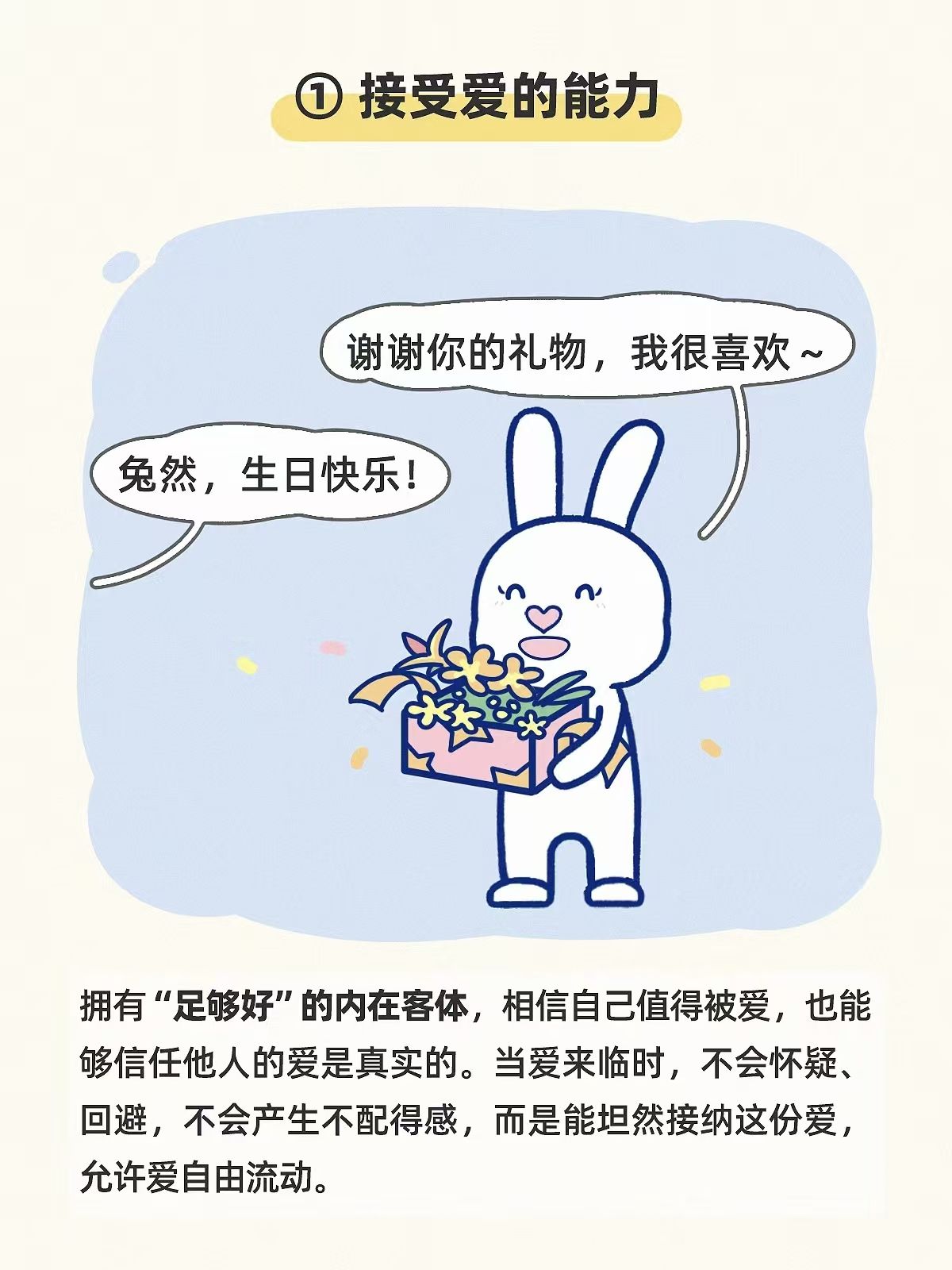 拥有“足够好”的内在客体,相信自己值得被爱,也能够信任他人的爱是真实的。当爱来临时,不会怀疑、回避,不会产生不配得感,而是能坦然接纳这份爱,允许爱自由流动。