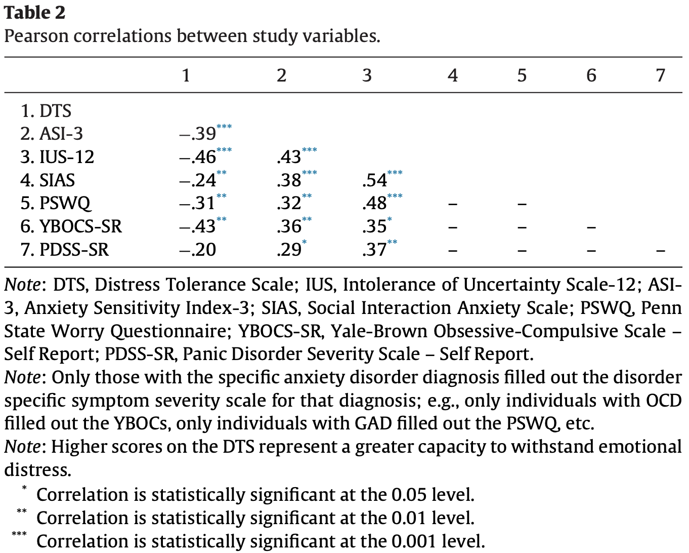 Laposa, J. M., Collimore, K. C., Hawley, L. L., & Rector, N. A. (2015). Distress tolerance in OCD and anxiety disorders, and its relationship with anxiety sensitivity and intolerance of uncertainty. Journal of anxiety disorders, 33, 8–14. https://doi.org/10.1016/j.janxdis.2015.04.003