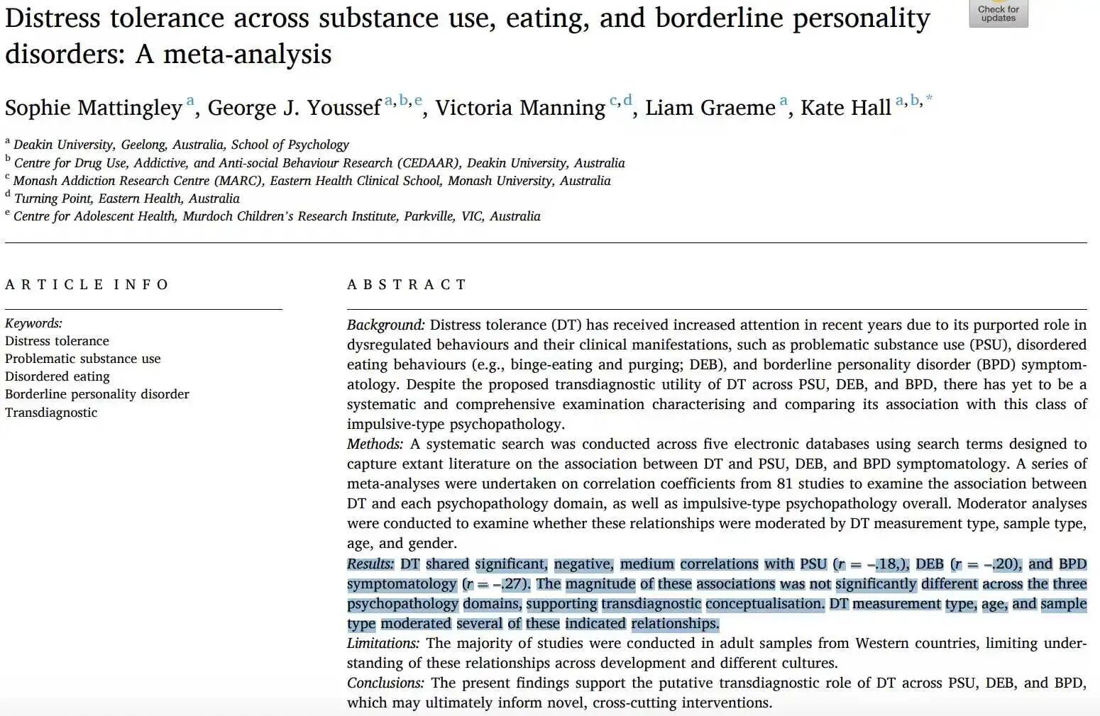 已有多项元分析研究表明,痛苦不耐受不仅是多种心理障碍(如焦虑障碍、进食障碍、BPD、PTSD、物质依赖障碍等)的跨诊断机制,也是其病因学基础以及维持症状持续和加重的关键心理过程。