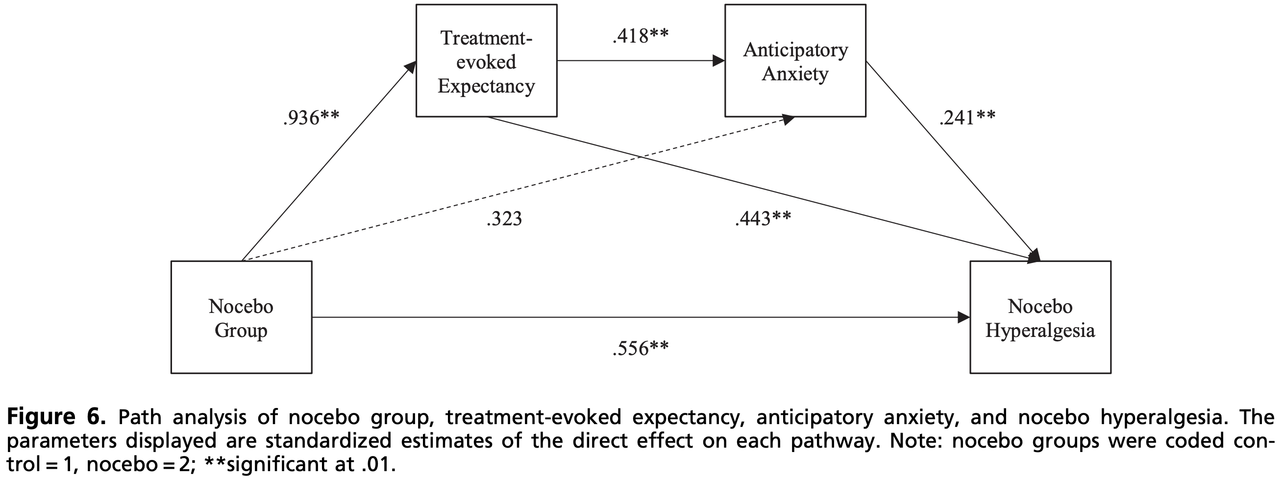 一项研究探讨了选择性关注(Attention Bias)、期望(expectancy)与预期性焦虑(anticipatory anxiety)在痛觉反安慰剂效应(nocebo hyperalgesia)中的作用,结果表明:反安慰剂效应的期望模型认为,人的负面期望(例如“……会更疼”)会直接导致疼痛症状加重。